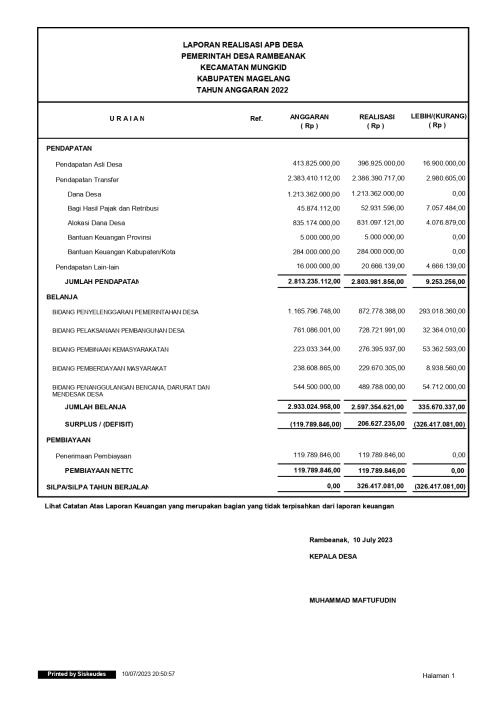 APB Desa Rambeanak Tahun Anggaran 2023