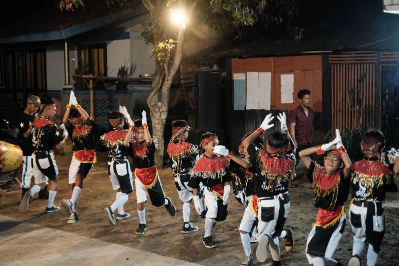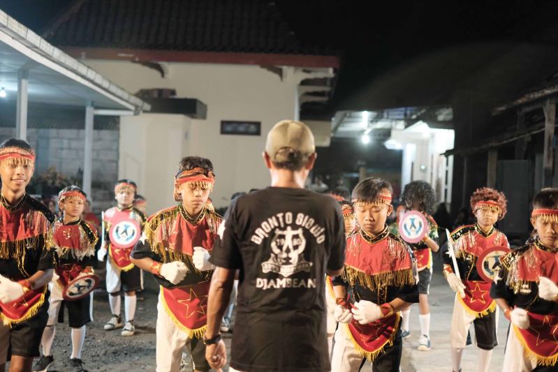 Gerakan tarian yang kuat dan bersemangat dibawakan oleh sekelompok penari anak laki-laki di Dusun Jambean Selatan malam itu. Menggambarkan sikap ksatria yang gagah berani dengan kostum khasnya. Perpaduan warna hitam dengan hiasan emas, pedang dan tameng sebagai properti seperti ksatria.